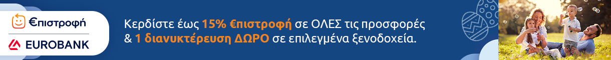 Επιπλέον 1 Διανυκτέρευση ΔΩΡΟ και ΕΠΙΠΛΕΟΝ έως 15% €πιστροφή Eurobank!
